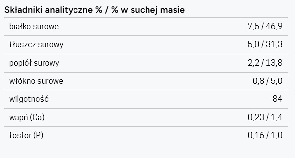 Skład: Skład: Kurczak – 55% (mięso mięśniowe – 50%, wątróbka – 5%), indyk – 28% (mięso mięśniowe – 26%, serca – 2%), rosół z indyka – 16%, minerały – 0,9%, tauryna – 0,1%. Ze względu na charakter produkcji produkt może zawierać niewielkie ilości ryżu oraz mięsa innych gatunków zwierząt.